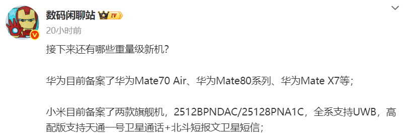华为方面,除了正在热销的Mate70系列外,还新增了Mate70 Air版本,同时Mate80系列也已浮出水面。