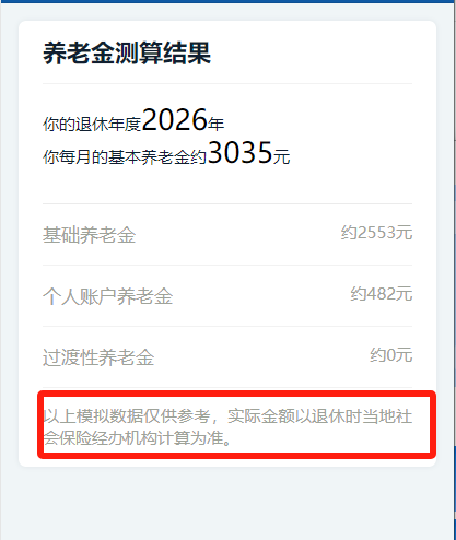 第五步:查看测算结果,注意哦实际领取金额以当地社保局计算为准;该结果仅供参考