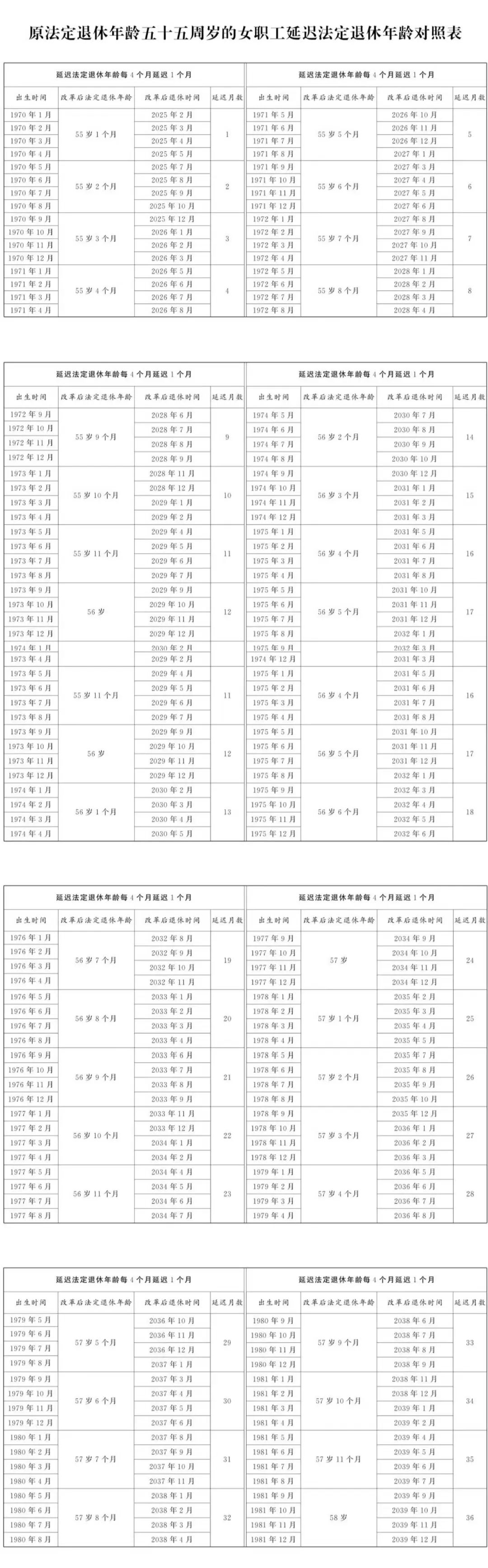 女职工(干部)(原55周岁):逐步延迟至58周岁(每4个月延迟1个月)。