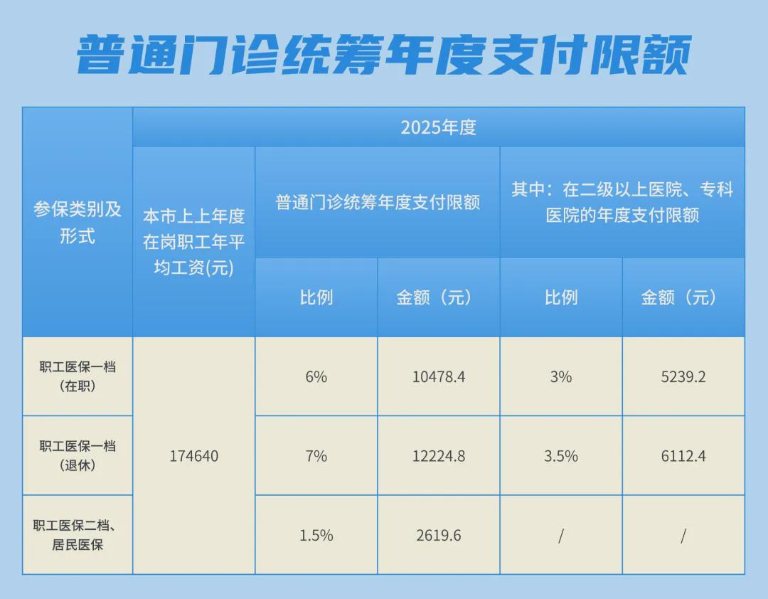 职工一档医保普通门诊年度支付限额,提高至在职人员为年社平工资的6%(约10478.4元)、退休人员7%(约12,225.22元),其中,在二级以上医院和专科医院的限额相应调整为在职人员3%(约5239.2元)、退休人员3.5%(约6112.4元)。
