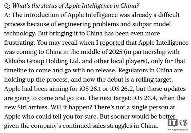 IT之家注意到,古尔曼之前发文称苹果曾计划与巴巴等其他本地合作伙伴合作,在 2025 年中期推出该服务,但很显然未能如期上线。“如今发布时间已成为一个无法确定的目标。”